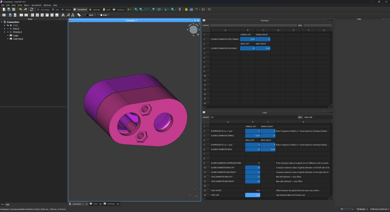 Using FreeCAD's integrated table-driven configuration function, each of the adapter’s inputs and outputs can be configured with six sizes of commercially available cable glands—each certified to the IP68 standard and equipped with a sealing ring—to form a splash-proof minimal housing.