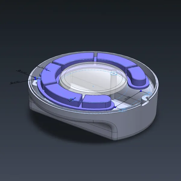 The particular technical challenge in designing the housing shells involved the circular arrangement of the controls around the round display, in combination with the positioning of the needed screw domes on the base.